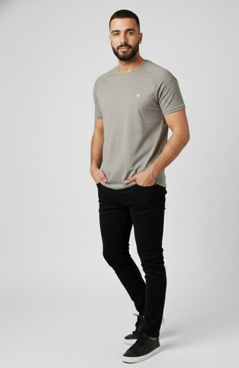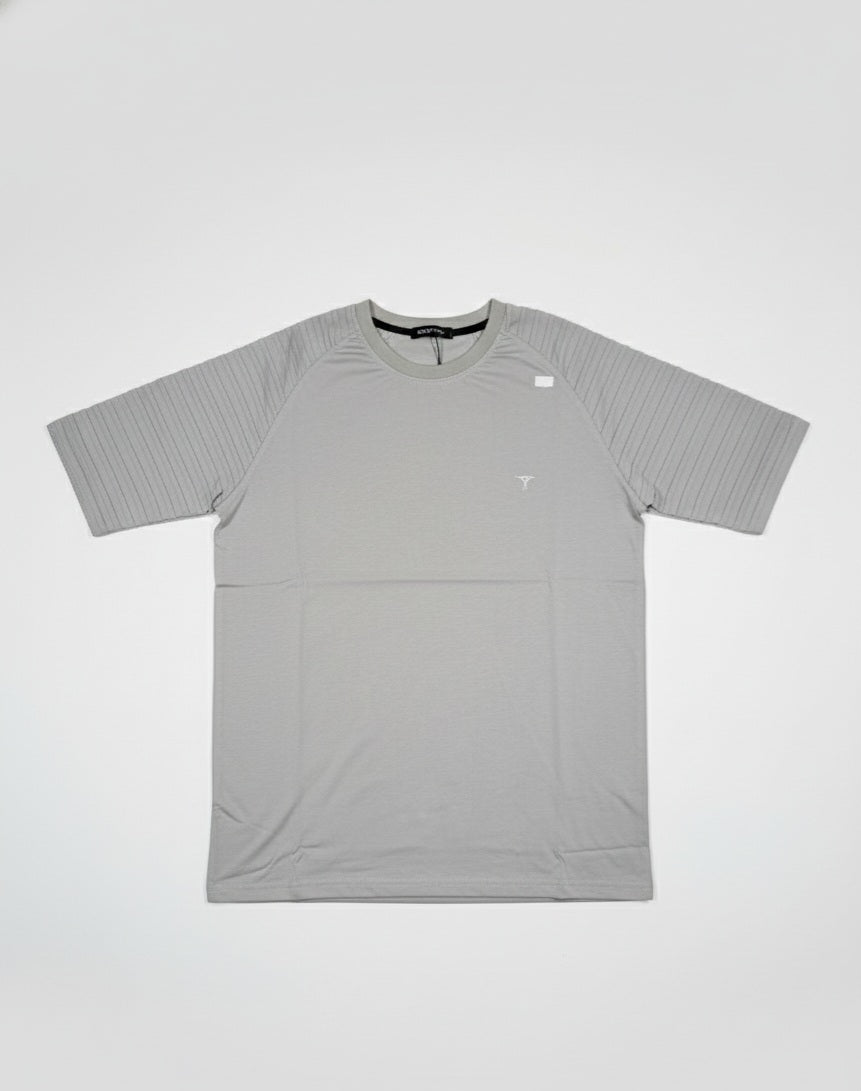 Основната част на тениската е в елегантно сиво-бежов (taupe/stone) цвят, който лесно се съчетава. Акцентът пада върху иновативните, релефни панели на раменете и ръкавите. Тези хоризонтални линии не само добавят модерен, футуристичен вид, но и придават допълнителна структура и атлетичност на горната част на тялото.